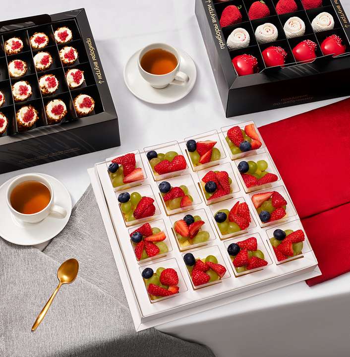— Фруктовое ассорти из сочных ягод и фруктов в креманках: спелая голубика и клубника с неповторимым ароматом, сладкий виноград и экзотический ананас, 16 шт.