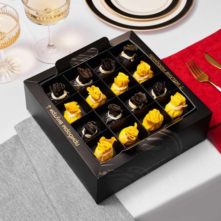 Изысканная композиция из двух видов нежных блинчиков с икрой и воздушным сливочным муссом. Золотистые пшеничные блинчики с куркумой гармонично сочетаются с насыщенным вкусом щучьей икры, а элегантные чёрные блинчики подчёркивают нежность икры палтуса.