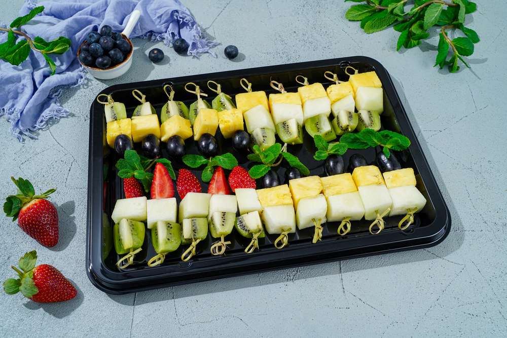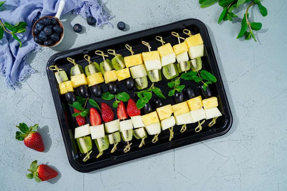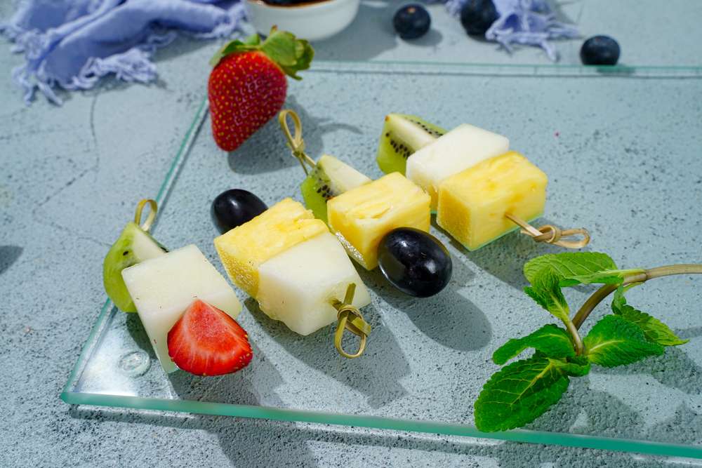 Простой, полезный и красивый десерт, который идеально подходит для тех, кто следит за калориями и избегает рафинированного сахара. Свежие и спелые сезонные фрукты в на шпажках.