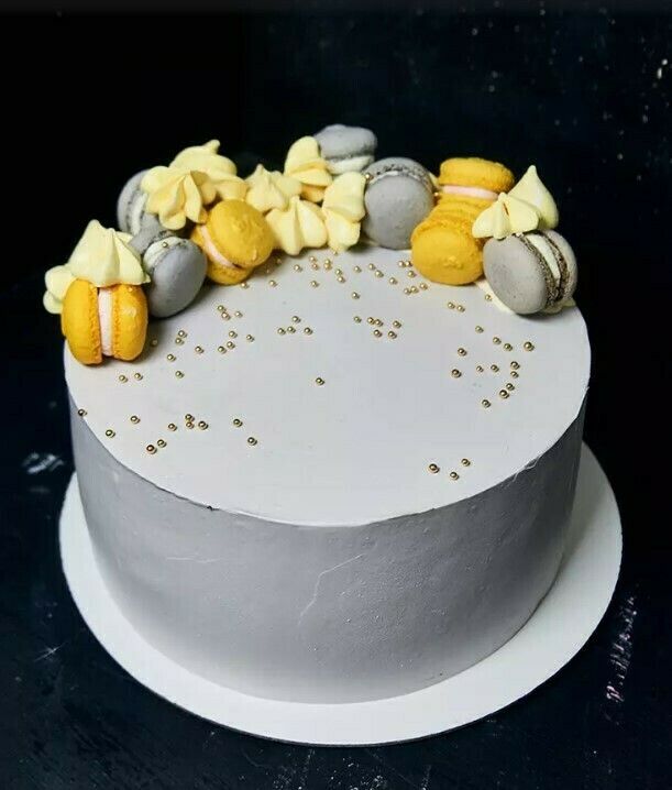 Торт выполнен в серой цветовой гамме и украшен сладостями, выложенными полукругом. Безе и макаронс имеют желтый и серый цвет.