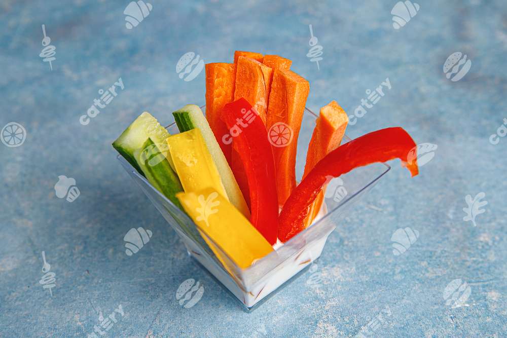 Нарезка болгарского перца, свежего огурца, морковки, сырный соус блю чиз. Общий вес – 100 г