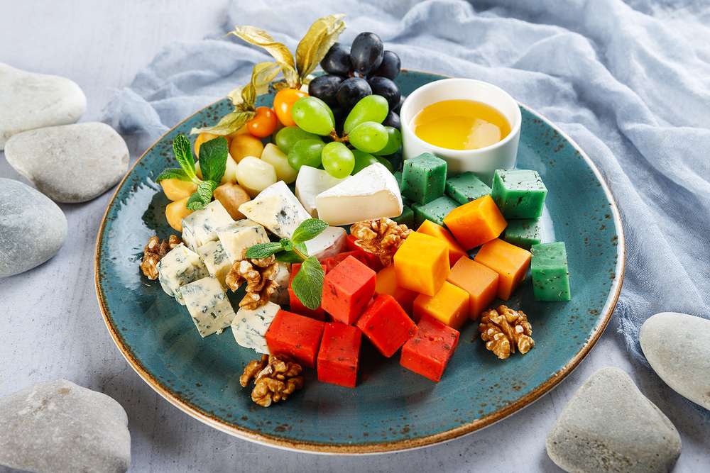Ассорти сыров: «Камамбер», «Бри», зеленый и красный сыр, копченый. Подается с виноградом, грецким орехом, ягодами и медом. Общий вес – 500 г
