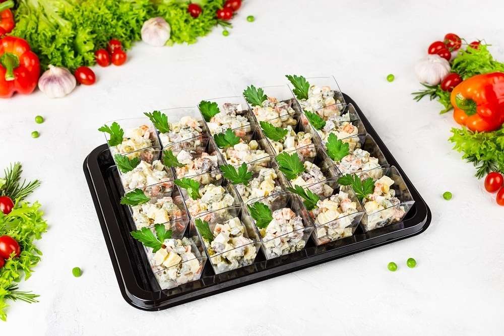 Любимый традиционный салат из овощей, горошка и вареной говядины. Заправлен вкуснейшим майонезом собственного производства исключительно из натуральных ингредиентов. ***Мы заботимся о Вас и Ваших гостях — к платтеру прилагается набор из 10 экологичных и безопасных вилок из биоразлагаемого кукурузного крахмала.