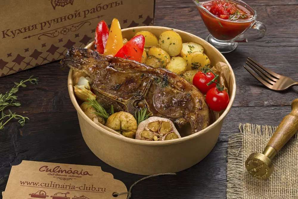 Седло барашка, картофель бэби, перец болгарский, чеснок, лук репчатый, перец чили красный/зеленый, тимьян свежий, соус терияки, соус соевый, шампиньоны, масло растительное, ароматное масло, соус «Аджарский», соль, розмарин, перец розовый, помидоры черри на ветке.