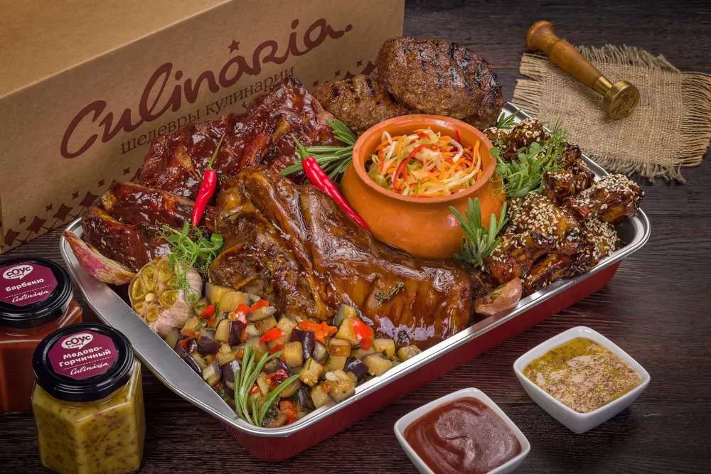 Запечённая рулька, рёбрышки барбекю, ароматные люля-кебаб из баранины, острые крылышки в медовой карамели. На гарнир соте из баклажан и болгарского перца. Отдельно подаётся холодный хрустящий салат из капусты, маринованной с хреном и перчиком халапеньо и соус медово-горчичный.