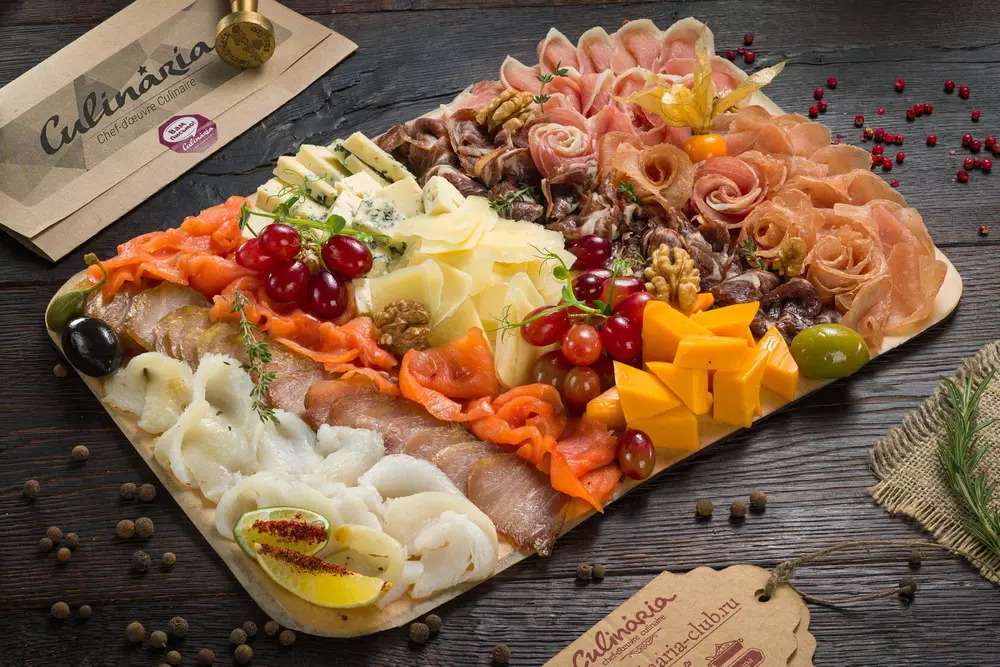 Попурри деликатесов холодного копчения — это изысканная закуска для праздничного стола. Рыбное ассорти из осетрины, лосося, палтуса и мясное плато из говяжьей вырезки, свиной корейки и филе индейки. А также благородные сыры — пармезан, чеддер и дор блю.