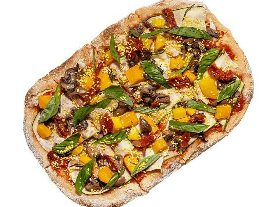 С томатным соусом, цукини, тыквой, шампиньонами, вялеными томатами, оливками, базиликом, оливковым маслом, гомасио и морской солью. Общий вес – 430 г