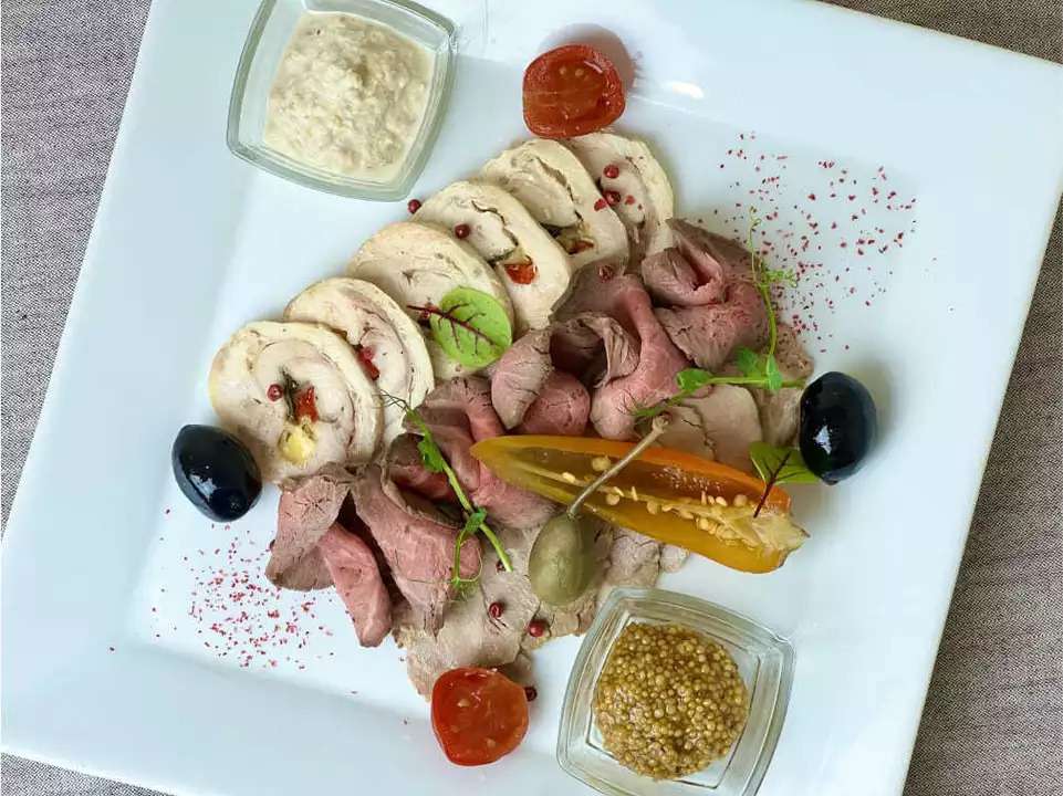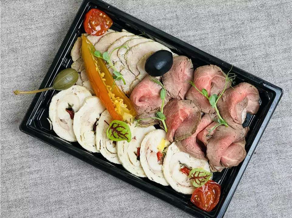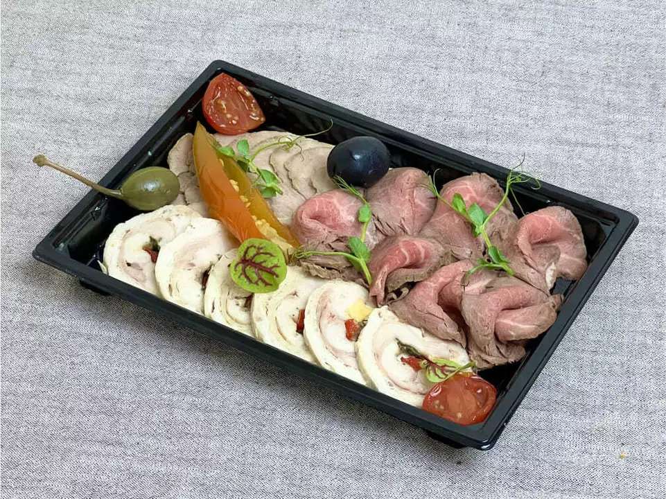 В наборе: — ростбиф из говяжьей вырезки — 70 г, — куриный рулет — 70 г, — запечённый окорок — 70 г, — маринованные овощи, — маслины, — горчичный соус — 20 г, — хрен — 20 г. Общий вес – 290 г