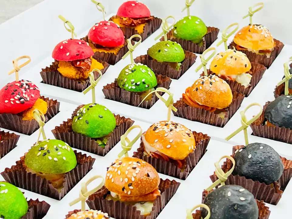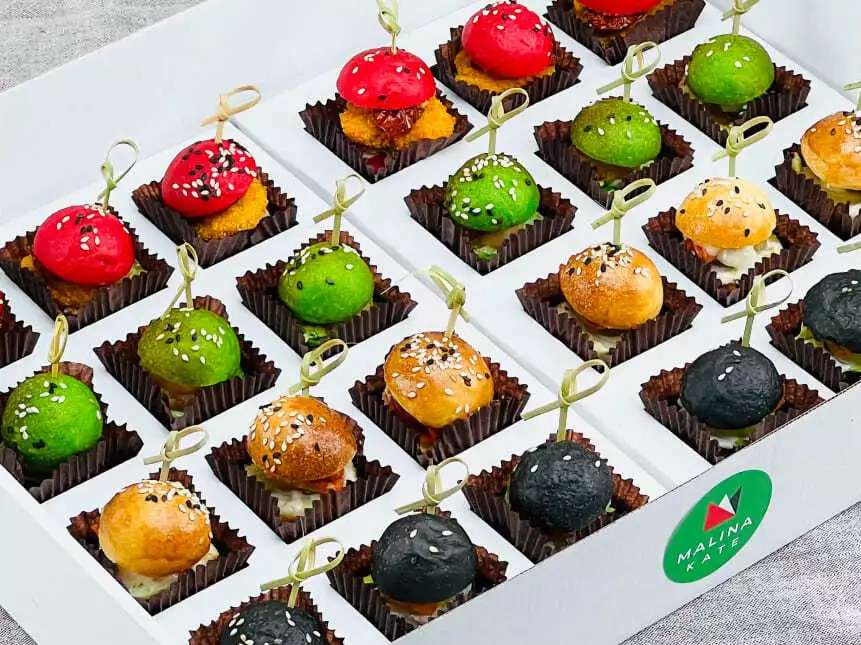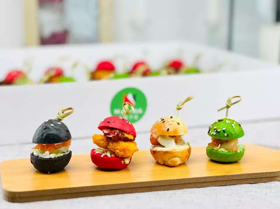— Канапе зелёный мини-бургер с креветкой, салатом «Айсберг» и соусом «Сладкий васаби»