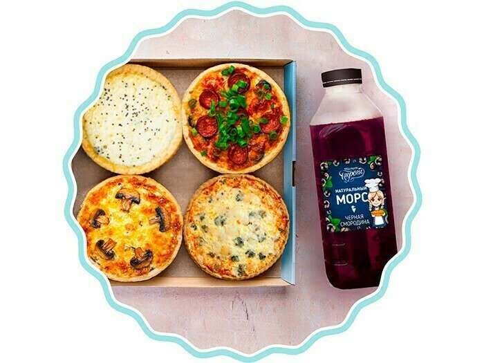 В набор входят: — Лоранская тарталетка— 1 шт.; — Мюнхенская тарталетка — 1 шт.; — Амстердамская тарталетка — 1 шт.; — Польская тарталетка — 1 шт.; — Морс на выбор — 1 л.