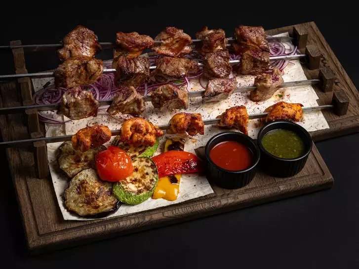 Шашлык из говяжьей вырезки, шашлык из баранины, шашлык из свинины, шашлык из курицы, баклажан, цукини, перец болгарский, соус сацебели. 680/ 170/ 40/ 120/ 80/ 80 г. Общий вес – 1170 г