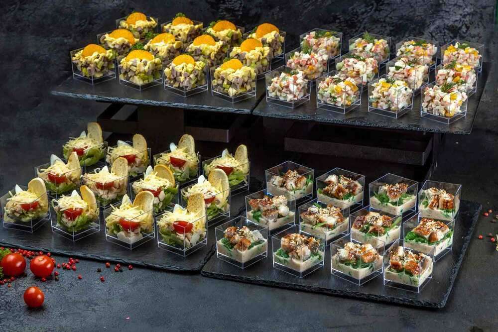 — Веррин Цезарь с курицей — 12 шт. — Веррин с крабовым салатом — 12 шт. — Салат из утки с апельсинами и артишоками — 12 шт. — Угорь с кунжутным соусом и чука салатом — 12 шт. Общий вес – 1.4 кг