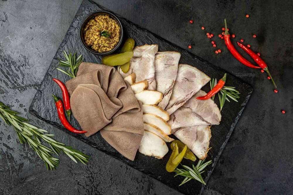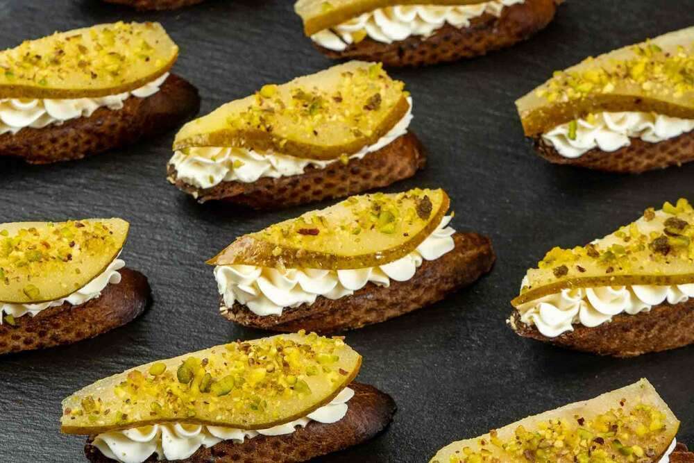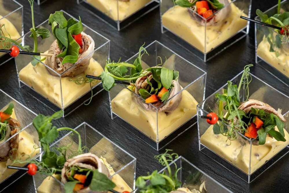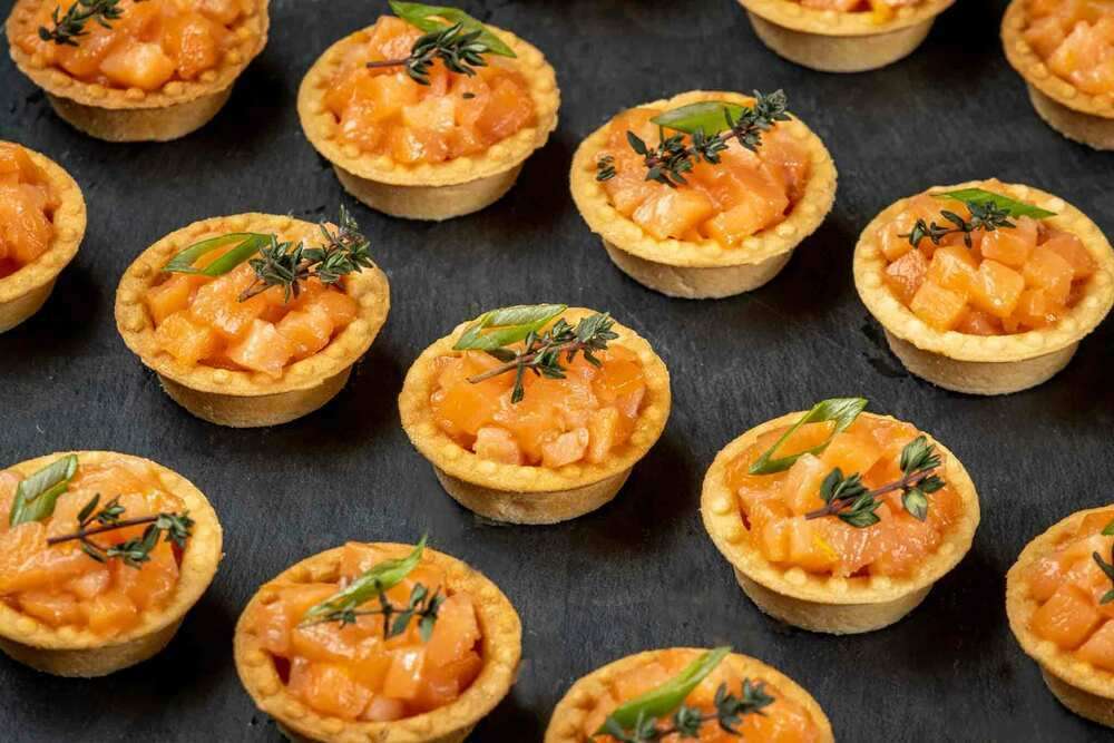 Состав: — Мини-тарталетка с тар-таром из лосося — 10 шт. — Мини-тарталетка с тар-таром из филе утки — 10 шт. — Канапе с омлетом томаго и креветкой — 10 шт. — Брускетта с сыром моцарелла — 10 шт. — Брускетта с фламбированной грушей — 10 шт. — Веррин с бужениной, рукколой и овощами — 12 шт. — Мясная тарелка — 270 г Общий вес – 2120 г