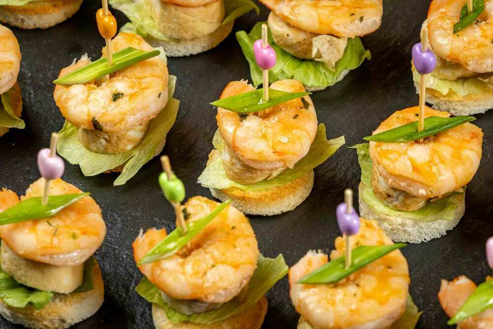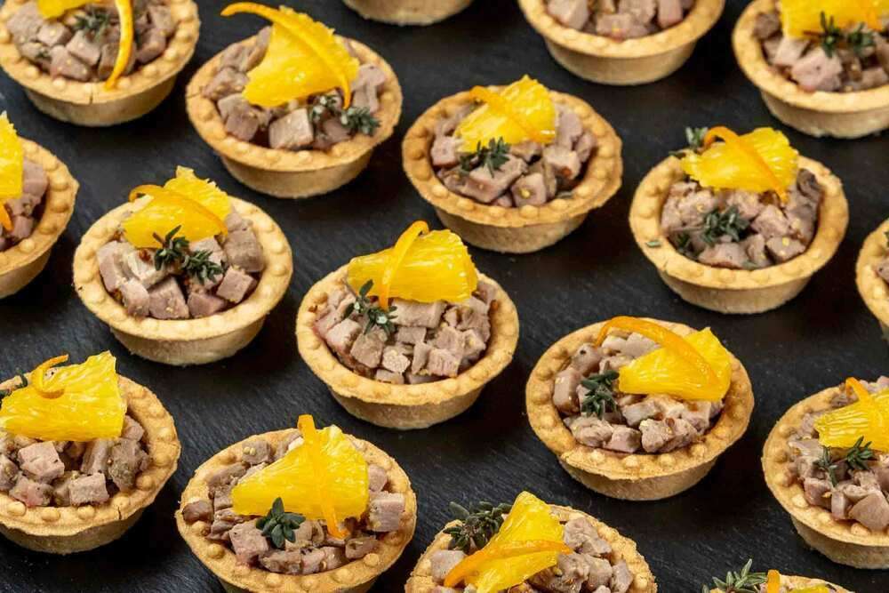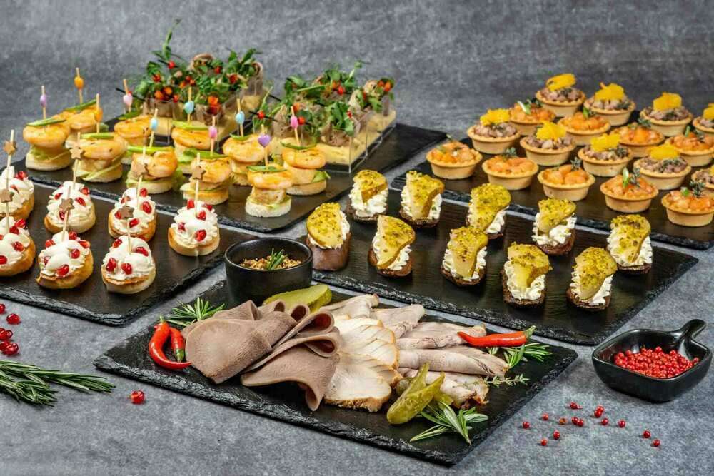 Фуршетный набор из мини-тарталеток с тар-таром из лосося и утки, канапе с креветкой и омлетом томаго, брускетт с моцареллой и фламбированной грушей, а также верринов с бужениной и овощами. Дополнен мясной тарелкой. Подходит для дней рождения, фуршетов и вечеринок.