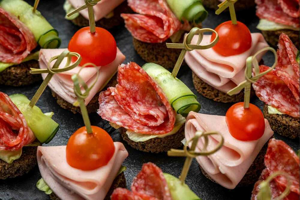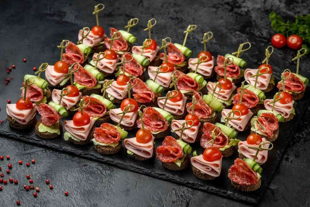 Миниатюрные канапе на бородинском хлебе — классика вкуса в стильной подаче. Хрустящий айсберг, сочные черри и свежий огурец дополняют нежную докторскую и марочную колбасы, а легкая пикантность майонеза и горчицы делает вкус ярким и запоминающимся. Идеальная сытная закуска для фуршета или праздничного стола. Общий вес – 1 кг
