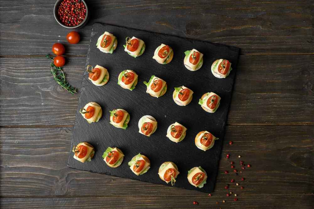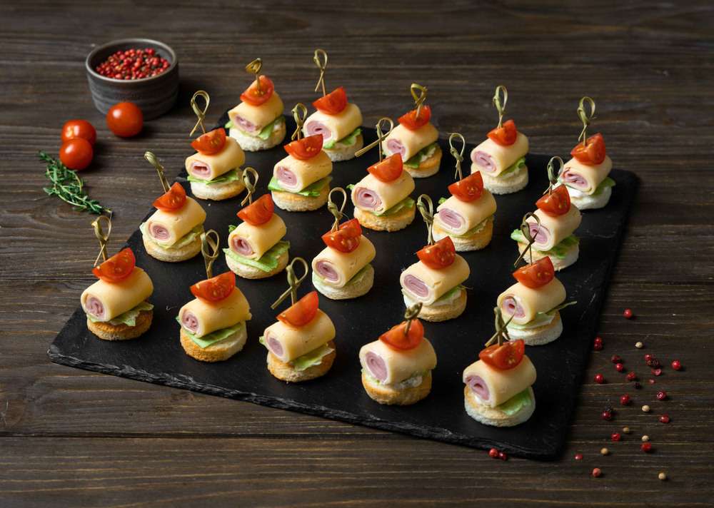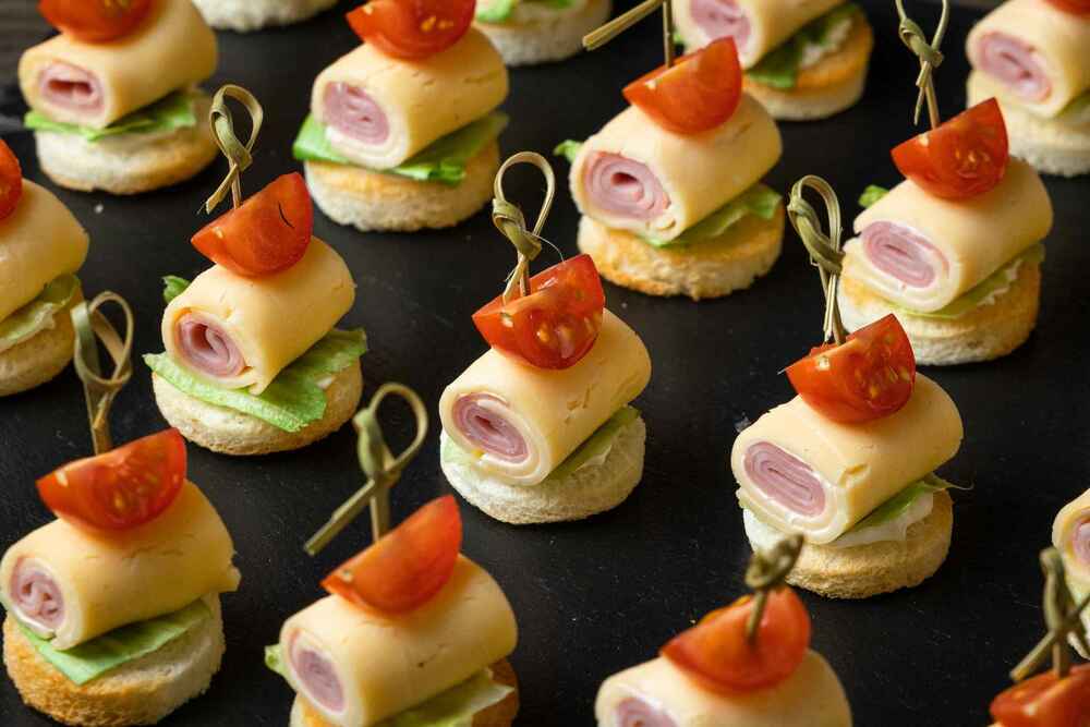 Канапе с ветчиной из индейки, нежным сыром креметта и пикантным гауда, дополненные сладостью помидоров черри и свежестью салата "Айсберг" на ломтике французского багета. Прекрасное угощение для фуршета или семейного вечера. Общий вес – 400 г