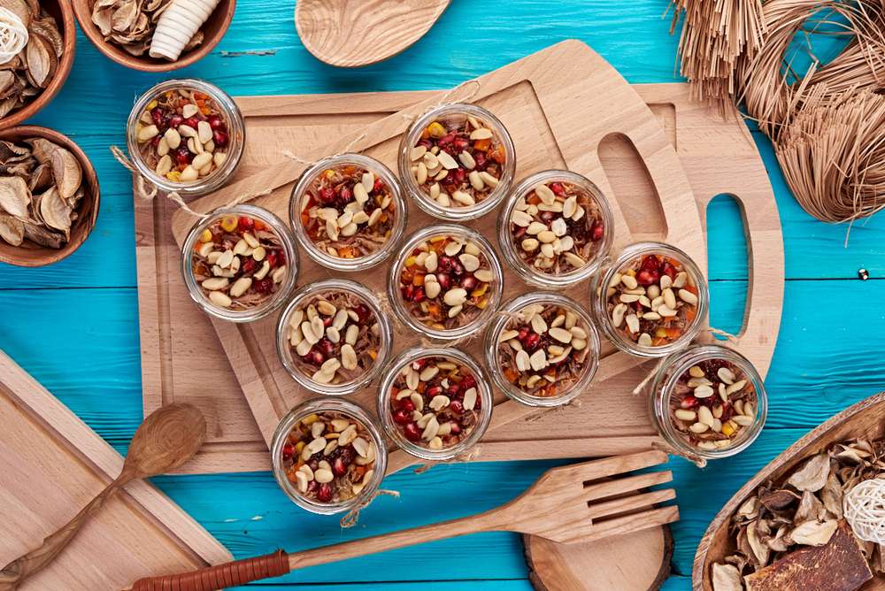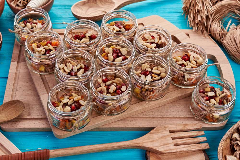 Салат с говядиной, гранатом, арахисом, кукурузой, перцем болгарским, морковью, горчицей, соусом терияки, мёдом и соус медово-горничным.