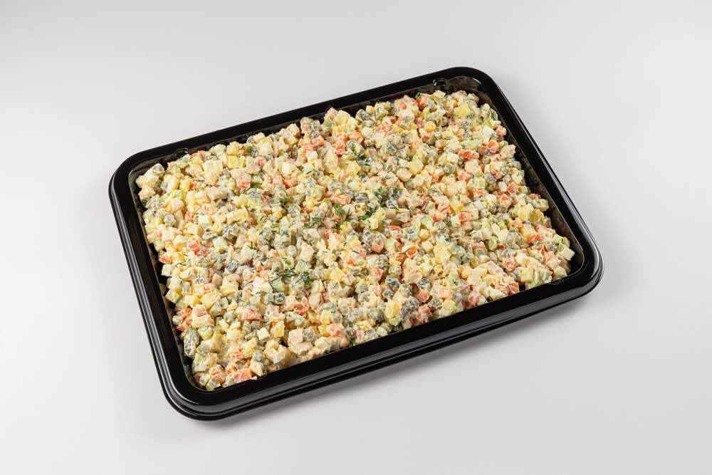 Филе куриное, морковь, картофель, огурцы, горошек с/м, яйцо, майонез для суши, огурцы, соль, перец черный Общий вес – 1 кг
