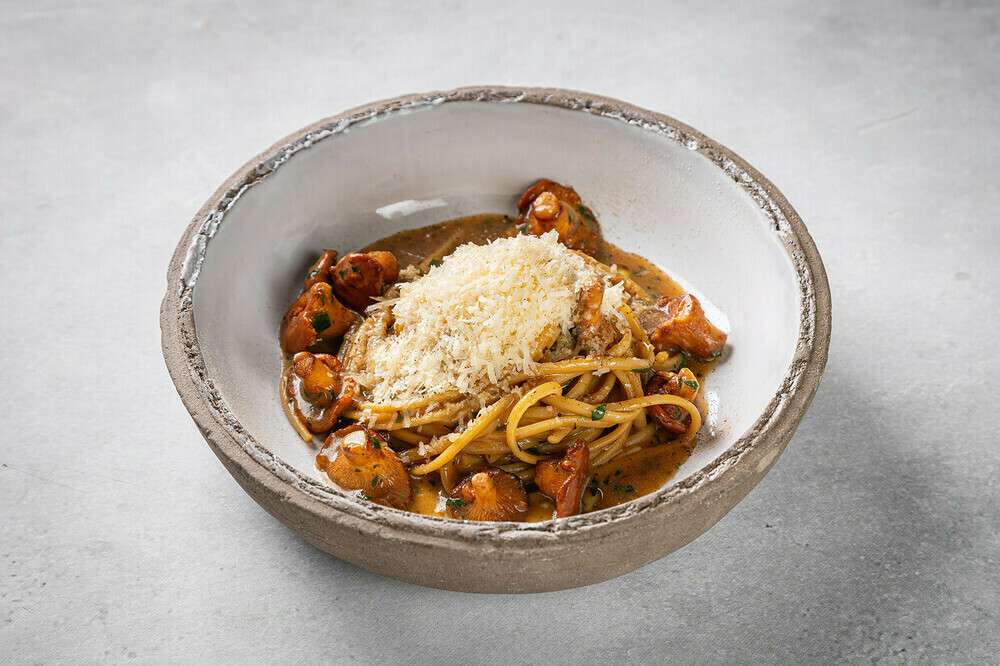 На оливковом масле обжариваются белые грибы, лук шалот, японские опята — намеки с добавлением шалфея и тимьяна. Затем добавляется коньяк и выпаривается, грибной бульон, сливочное масло, паста спагетинни и доводится до вкуса трюфельным и чесночным маслом. Сервируется сыром рикоттой и пудрой из сморчков и луком сибулет с трюфельным маслом.