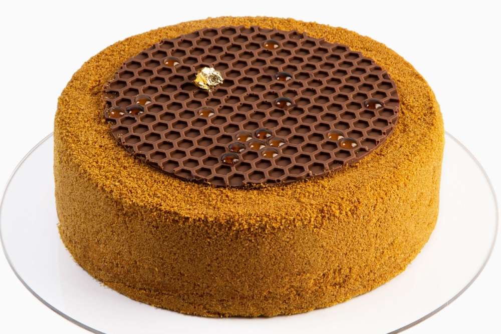 Медовик в лучших традициях! Баланс пористых золотистых коржей, приготовленных на гречишном меде, нежного сметанного крема с ароматной натуральной ванилью. Прослойка из солёной карамели добавляет пикантность вкусу любимого десерта. Безупречное сочетание сладкого и солёного. Декорирован сотой из молочного шоколада с добавлением капель гречишного мёда и пластинкой сусального золота.