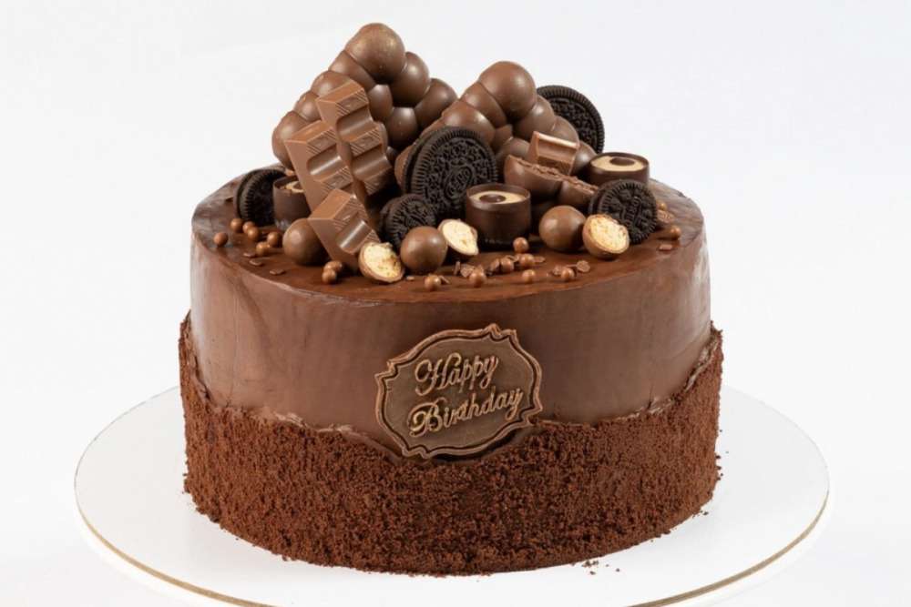 Торт с шоколадным декором украшен несколькими видами любимых шоколадных десертов.