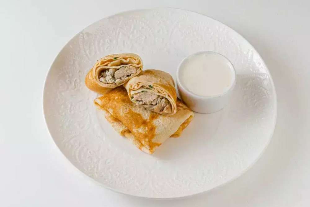 Блины с курицей, грибами и шпинатом — это вкусное и сытное блюдо, идеально подходящее для завтрака или основного приема пищи. Тонкие, нежные блины приготовлены из муки, молока и яиц, обладающие мягкой текстурой и слегка золотистой корочкой. Для начинки используется сочное куриное филе и филе индейки, обжаренные вместе с шампиньонами и луком пореем до золотистого цвета. Добавляется свежий шпинат, который придает начинке яркий цвет и полезные витамины, а также творожный сыр — он делает начинку особенно нежной и кремовой.